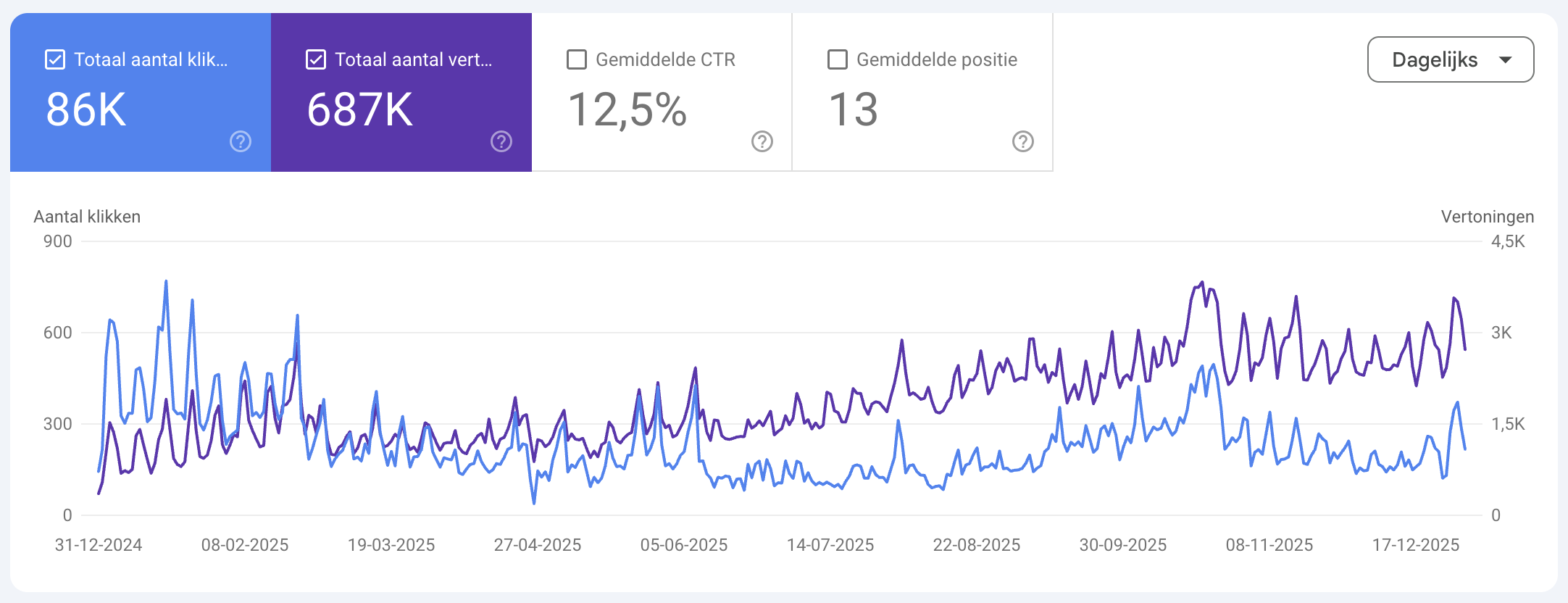 Ook in Google Search Console is de groei duidelijk terug te zien. Waar de website begin 2025 vooral zichtbaar was rondom de opening en de merknaam, is de zichtbaarheid in de loop van het jaar breed opgebouwd.